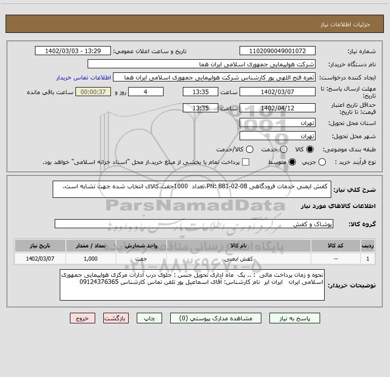 شرح کلی نیاز: کفش ایمنی خدمات فرودگاهی PN: 881-02-08،تعداد 1000جفت،کالای انتخاب شده جهت تشابه است.