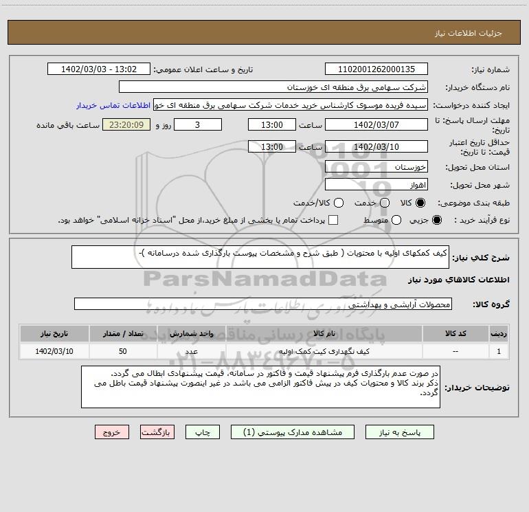 شرح کلی نیاز: کیف کمکهای اولیه با محتویات ( طبق شرح و مشخصات پیوست بارگذاری شده درسامانه )-