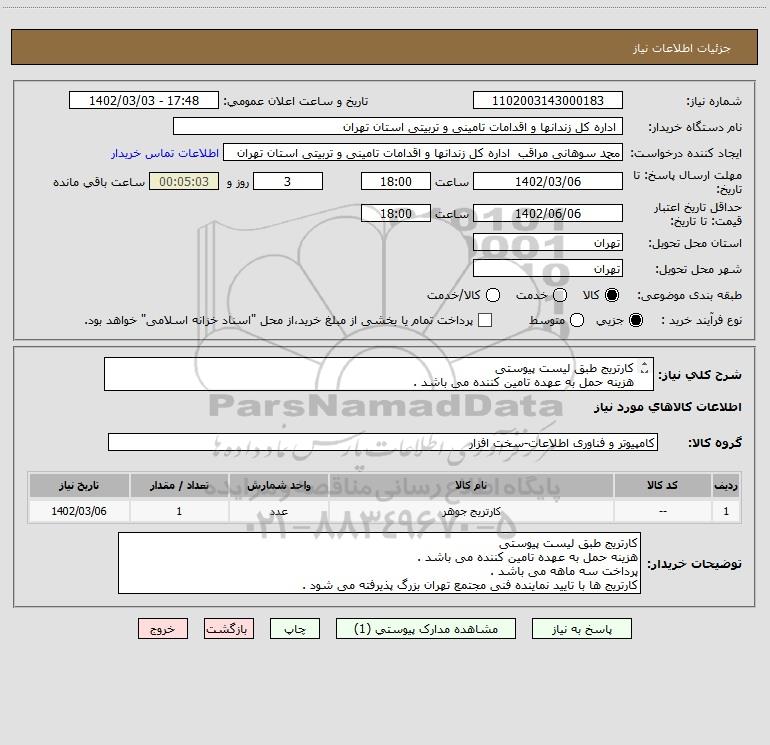 توضیحات خریدار:کارتریج طبق لیست پیوستی هزینه حمل به عهده تامین کننده می باشد . پرداخت سه ماهه می باشد . کارتریج ها با تایید نماینده فنی مجتمع تهران بزرگ پذیرفته می شود .