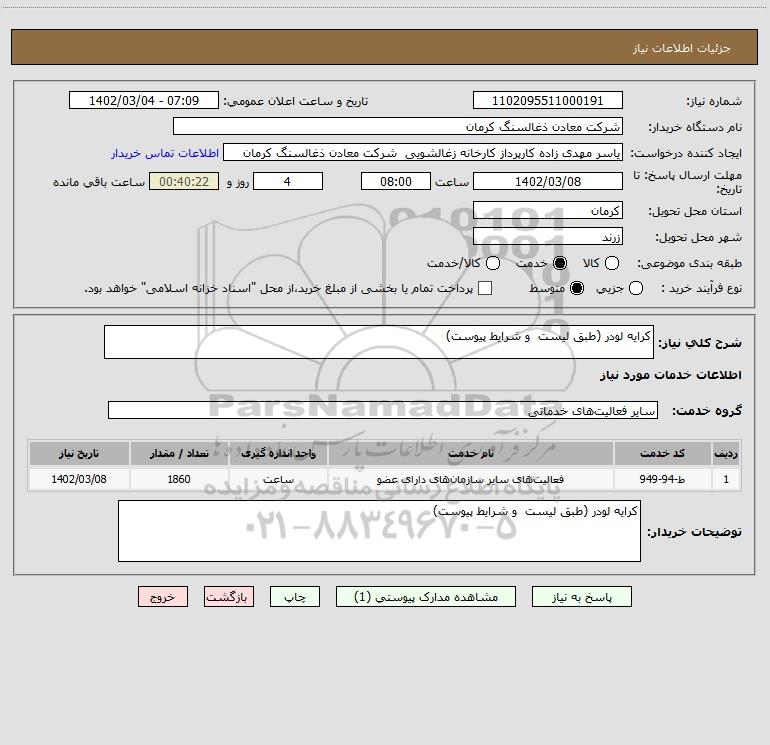 شرح کلی نیاز: کرایه لودر (طبق لیست و شرایط پیوست)