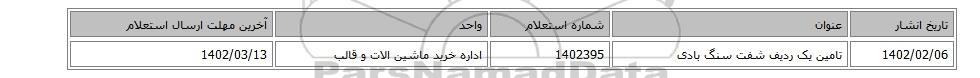 | 1402/02/06 | تامین یک ردیف شفت سنگ بادی | 1402395 | اداره خرید ماشین الات و قالب | 1402/03/13 |