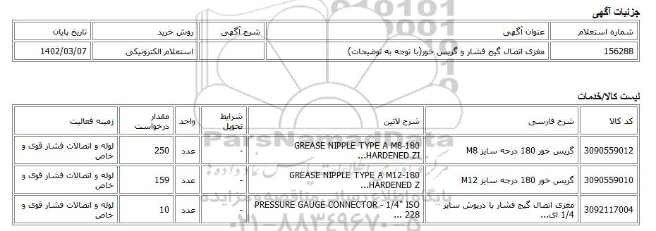 156288مغزی اتصال گیج فشار و گریس خور(با توجه به توضیحات)استعلام الکترونیکی1402/03/07