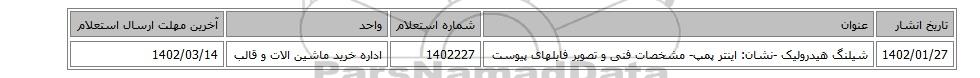 | 1402/01/27 | شیلنگ هیدرولیک -نشان: اینتر پمپ- مشخصات فنی و تصویر فایلهای پیوست | 1402227 | اداره خرید ماشین الات و قالب | 1402/03/14 |