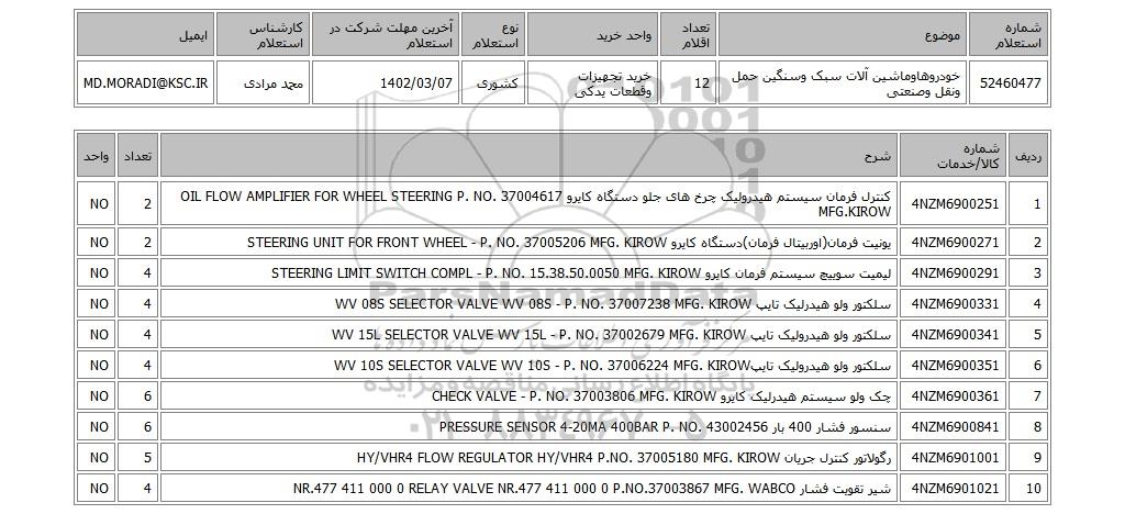 52460477خودروهاوماشین آلات سبک وسنگین حمل ونقل وصنعتی12خرید تجهیزات وقطعات یدکیکشوری1402/03/07محمد مرادی MD.MORADI@KSC.IR