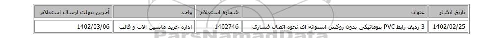 | 1402/02/25 | 3 ردیف رابط PVC پنوماتیکی بدون روکش استوانه ای نحوه اتصال فشاری | 1402746 | اداره خرید ماشین الات و قالب | 1402/03/06 |
