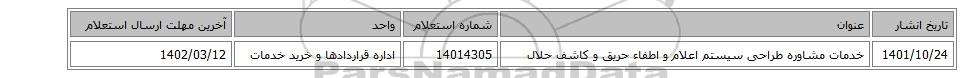 | 1401/10/24 | خدمات مشاوره طراحی سیستم اعلام و اطفاء حریق و کاشف حلال | 14014305 | اداره قراردادها و خرید خدمات | 1402/03/12 |