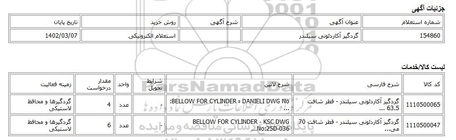 | 154860 | گردگیر آکاردئونی سیلندر | استعلام الکترونیکی | 1402/03/07 |