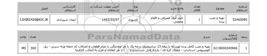 | 52465080 | تهیه و نصب پرده | 1 | خرید مواد مصرفی و اقلام عمومی | کشوری | 1402/03/07 | ایمان شیرزادی | I.SHIRZADI@KSC.IR |