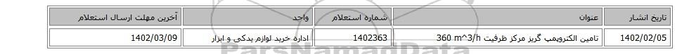 | 1402/02/05 | تامین الکتروپمپ گریز مرکز ظرفیت 360 m^3/h | 1402363 | اداره خرید لوازم یدکی و ابزار | 1402/03/09 |