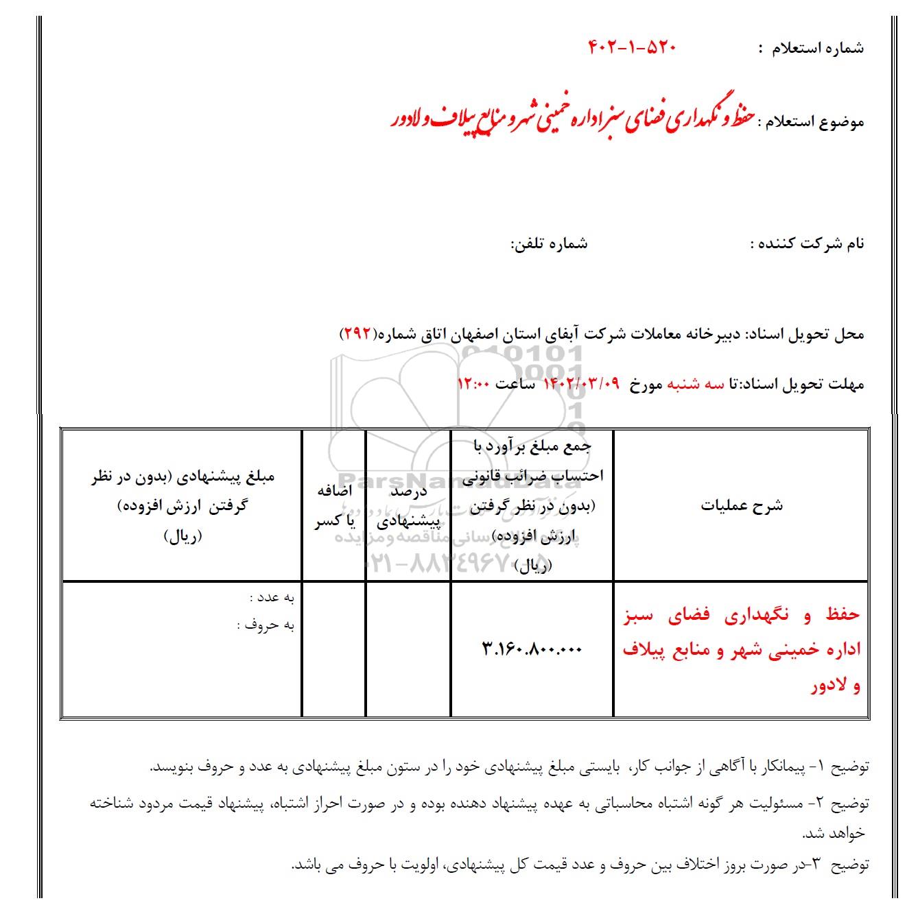 موضوع استعلام:حفظ و نگهداری فضای سبز اداره خمینی شهر و منابع پیلاف و لادور