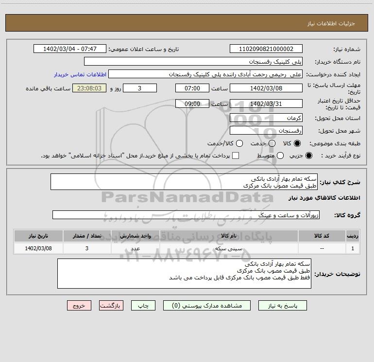 شرح کلی نیاز: سکه تمام بهار آزادی بانکی طبق قیمت مصوب بانک مرکزی