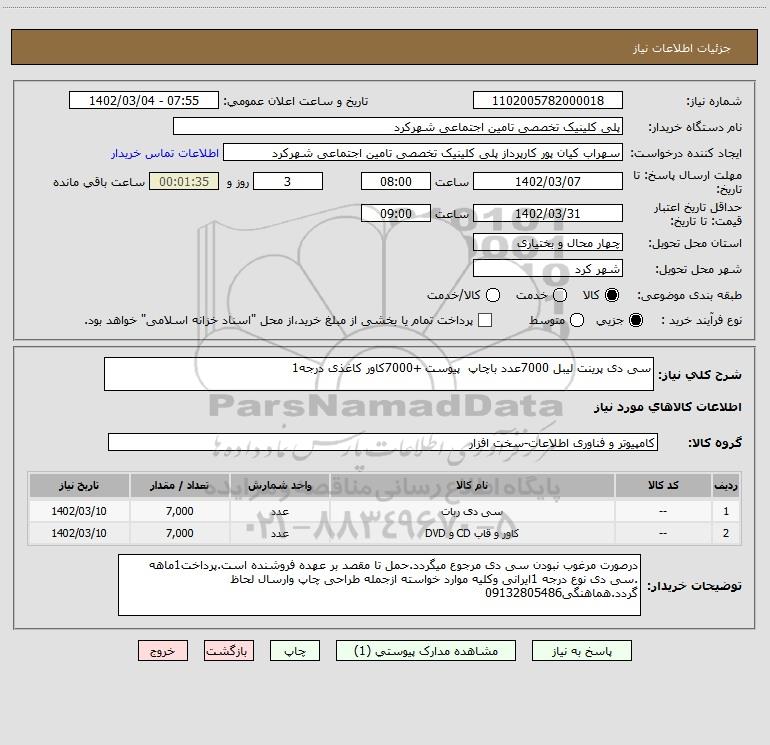شرح کلی نیاز: سی دی پرینت لیبل 7000عدد باچاپ پیوست +7000کاور کاغذی درجه1
