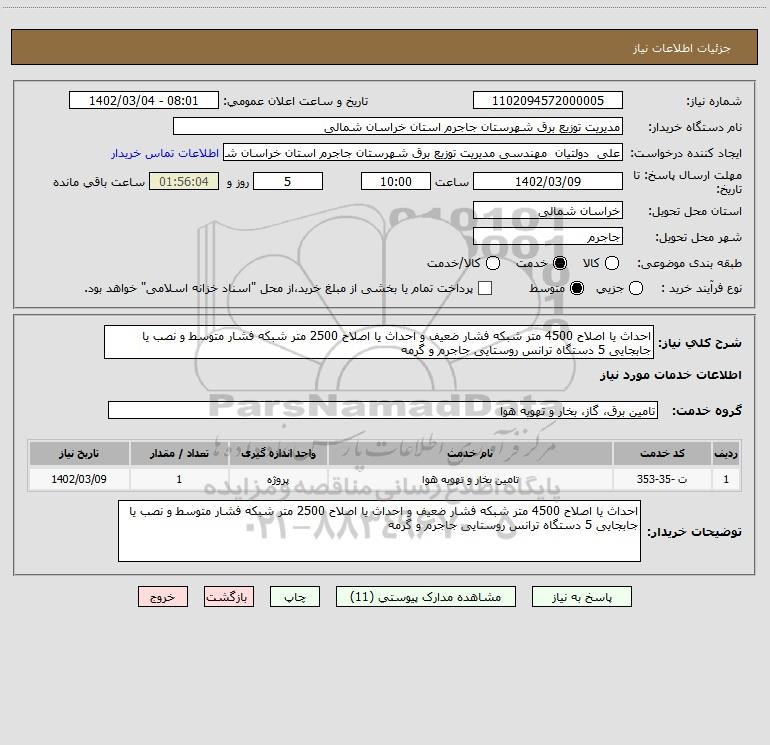 شرح کلی نیاز: احداث یا اصلاح 4500 متر شبکه فشار ضعیف و احداث یا اصلاح 2500 متر شبکه فشار متوسط و نصب یا جابجایی 5 دستگاه ترانس روستایی جاجرم و گرمه