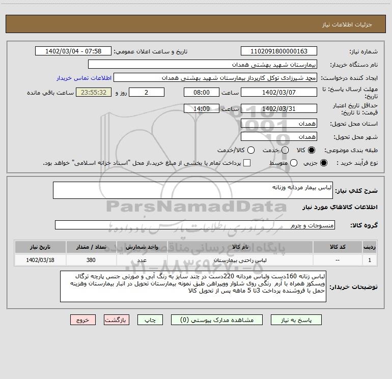 شرح کلی نیاز: لباس بیمار مردانه وزنانه