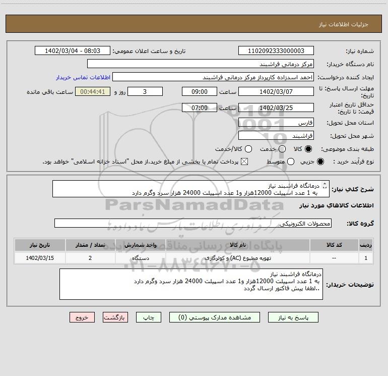 شرح کلی نیاز: درمانگاه فراشبند نیاز به 1 عدد اسپیلت 12000هزار و1 عدد اسپیلت 24000 هزار سرد وگرم دارد ..لطفا پیش فاکتور ارسال گردد