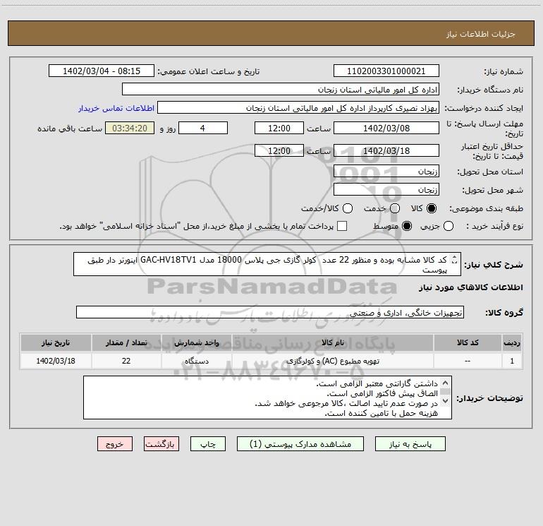 شرح کلی نیاز: کد کالا مشابه بوده و منظور 22 عدد کولر گازی جی پلاس 18000 مدل GAC-HV18TV1 اینورتر دار طبق پیوست