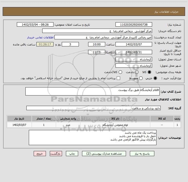 شرح کلی نیاز: اقلام آزمایشگاه طبق برگ پیوست