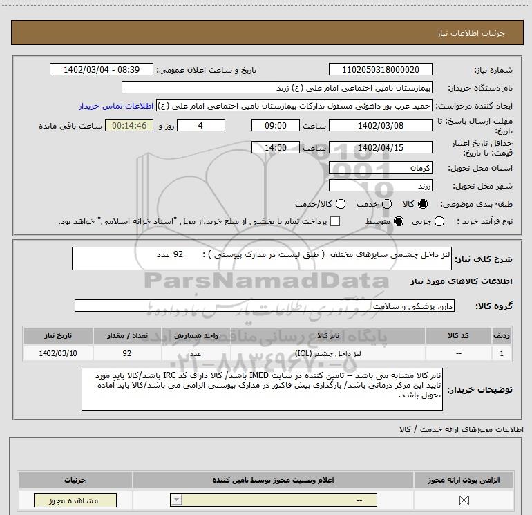 | 1 | -- | لنز داخل چشم (IOL) | عدد | 92 | 1402/03/10 |