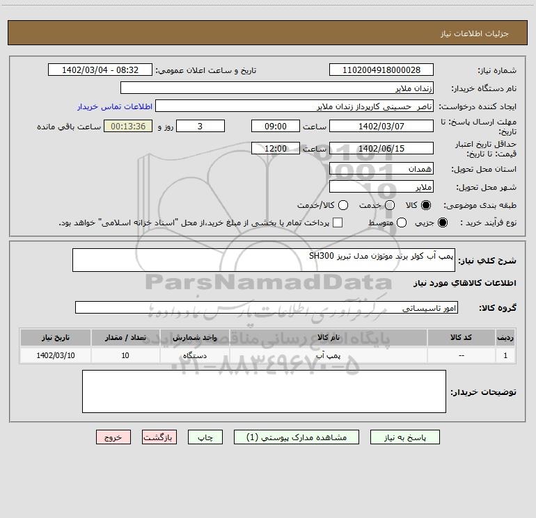 شرح کلی نیاز: پمپ آب کولر برند موتوژن مدل تبریز SH300