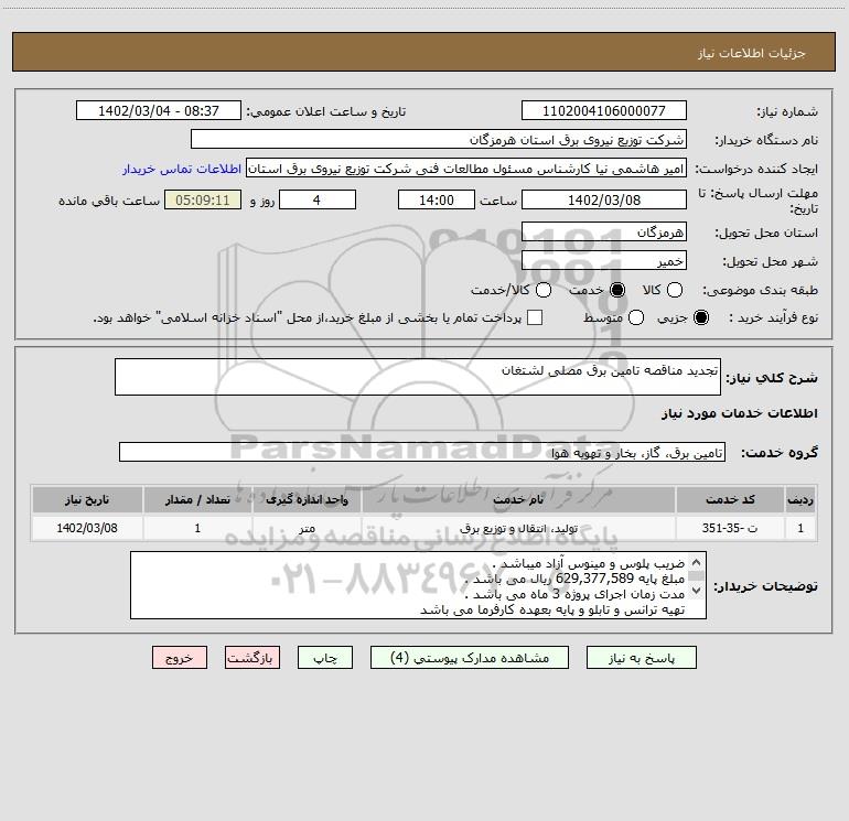 شرح کلی نیاز: تجدید مناقصه تامین برق مصلی لشتغان