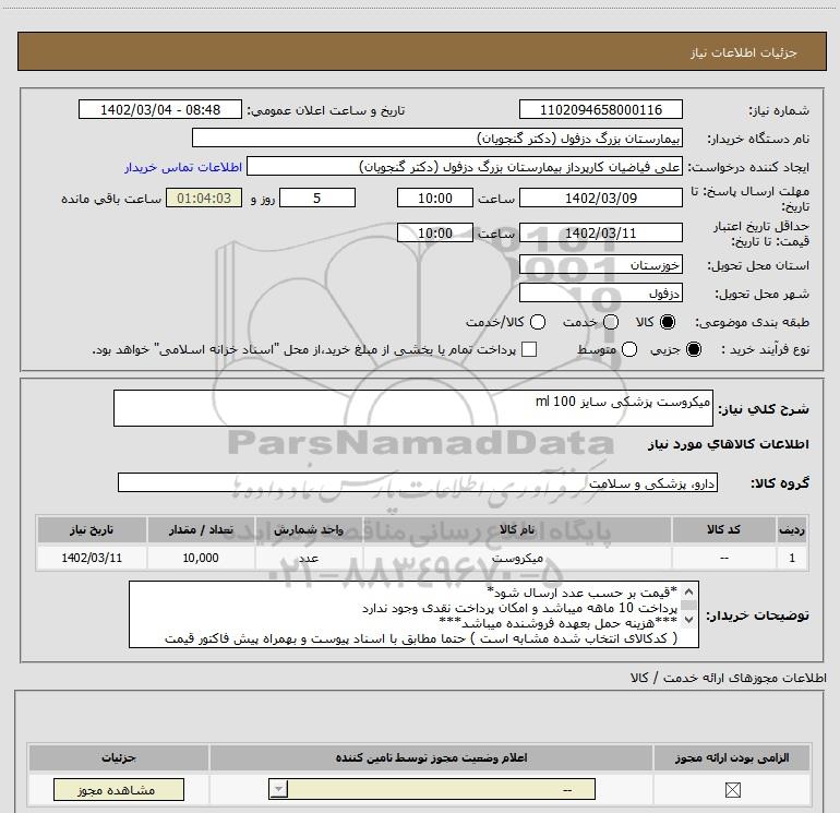 استعلام میکروست پزشکی سایز 100 ml, استعلام میکروست پزشکی سایز 100 ml