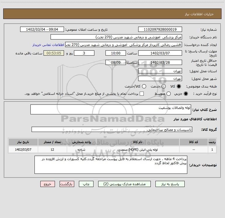 شرح کلی نیاز: لوله واتصالات پوشفیت