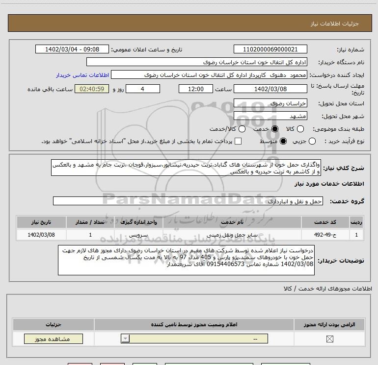شرح کلی نیاز: واگذاری حمل خون از شهرستان های گناباد،تربت حیدریه،نیشابور،سبزوار،قوچان ،تربت جام به مشهد و بالعکس و از کاشمر به تربت حیدریه و بالعکس