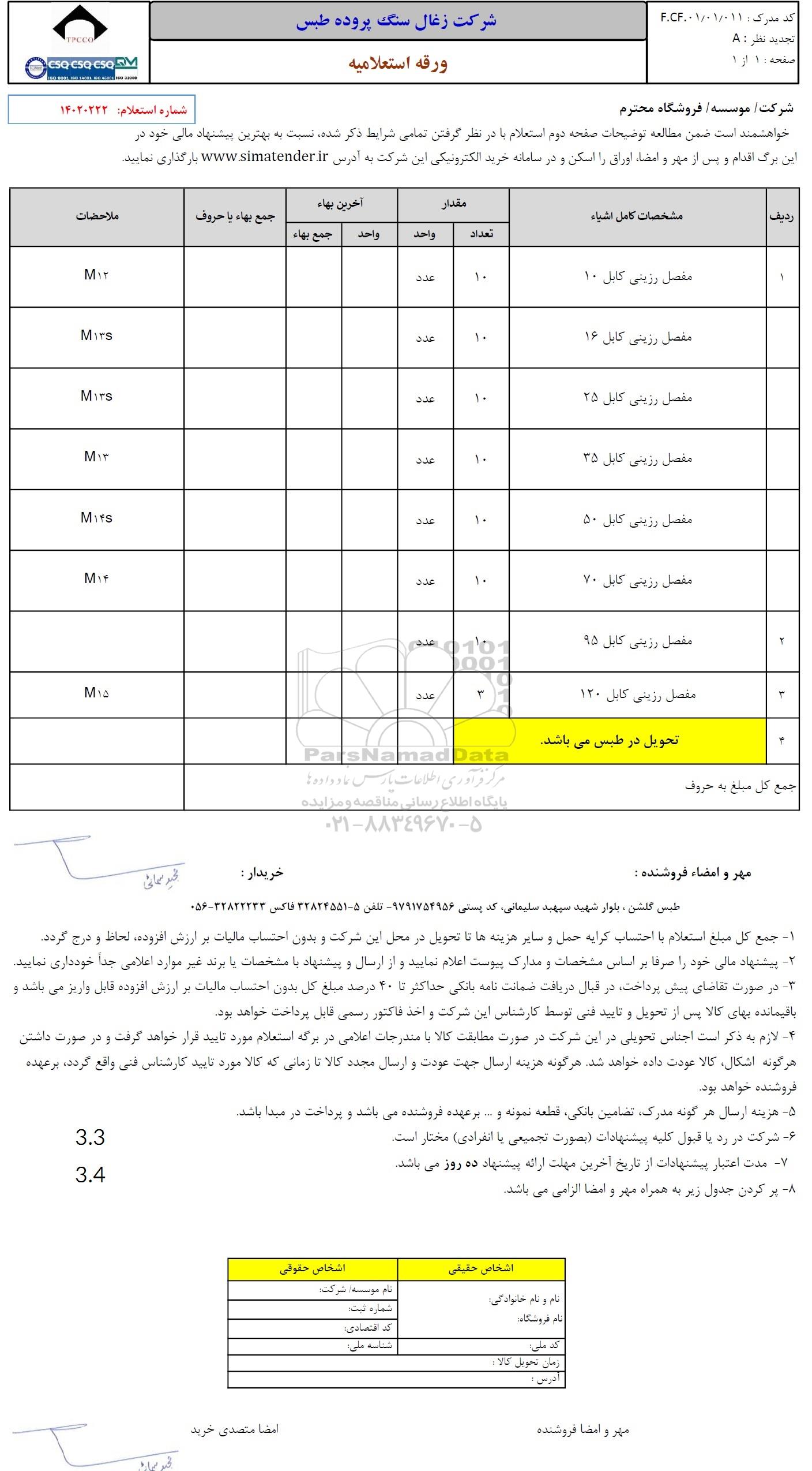 خواهشمند است ضمن مطالعه توضیحات صفحه دوم استعلام با در نظر گرفتن تمامی شرایط ذکر شده نسبت به بهترین پیشنهاد مالی خود در این برگ اقدام و پس از مهر و امضا اوراق را اسکن و در سامانه خرید الکترونیکی این شرکت به آدرس www.simatender.ir بارگذاری نمایید.