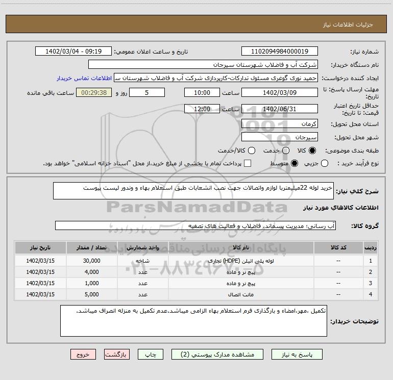 نام دستگاه خریدار:شرکت آب و فاضلاب شهرستان سیرجان