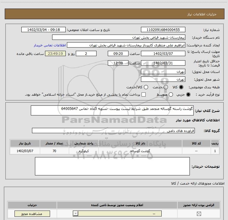 | 1 | -- | گوشت گوساله | کیلوگرم | 70 | 1402/03/07 |