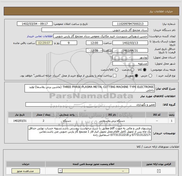 استعلام THREE PHASE PLASMA METAL CUTTING MACHINE TYPE ELECTRONIC (ماشین برش پلاسما) تولید داخلی, استعلام THREE PHASE PLASMA METAL CUTTING MACHINE TYPE ELECTRONIC (ماشین برش پلاسما) تولید داخلی