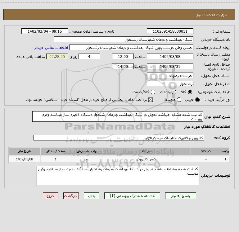 شرح کلی نیاز: کد ثبت شده مشابه میباشد تحویل در شبکه بهداشت ودرمان رشتخوار دستگاه ذخیره ساز میباشد وفرم پیوست