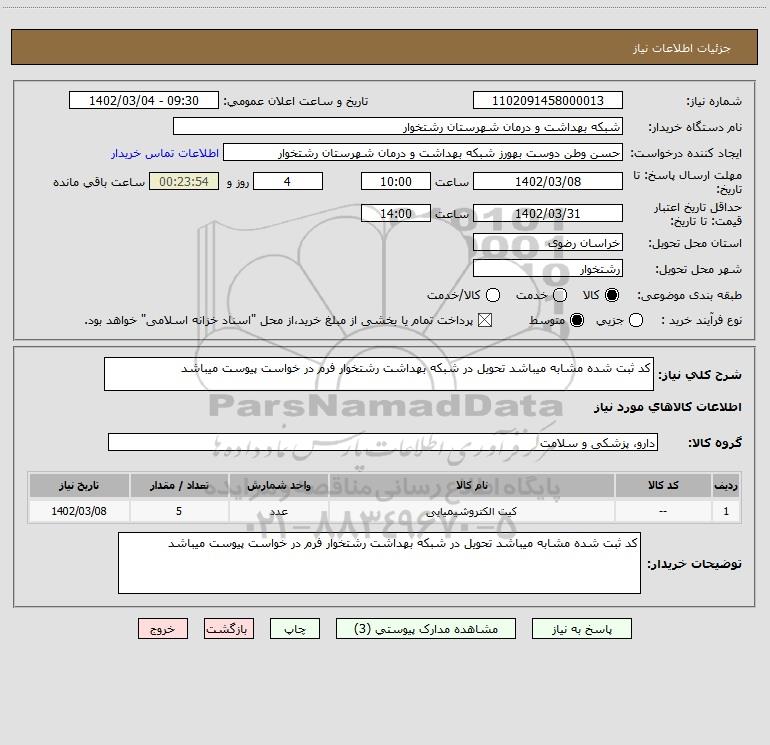 نام دستگاه خریدار:شبکه بهداشت و درمان شهرستان رشتخوار