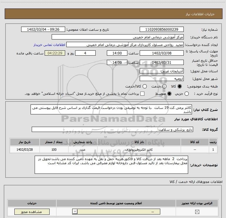 شرح کلی نیاز: کاتتر پرمی کت 19 سانت ،با توجه به توصیفی بودن درخواست قیمت گذاری بر اساس شرح فایل پیوستی می باشد