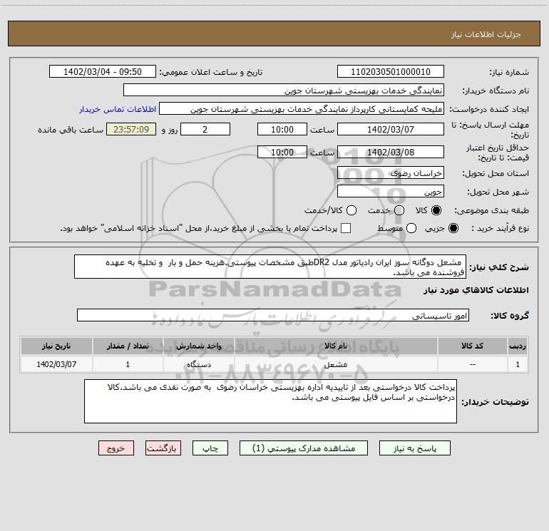 استعلام مشعل دوگانه سوز ایران رادیاتور مدل DR2طبق مشخصات پیوستی.هزینه حمل و بار و تخلیه به عهده فروشنده می باشد., استعلام مشعل دوگانه سوز ایران رادیاتور مدل DR2طبق مشخصات پیوستی.هزینه حمل و بار و تخلیه به عهده فروشنده می باشد.
