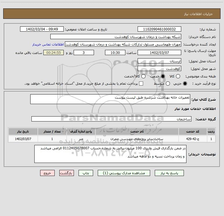 شرح کلی نیاز: تعمیرات خانه بهداشت شرشره طبق لیست پیوست