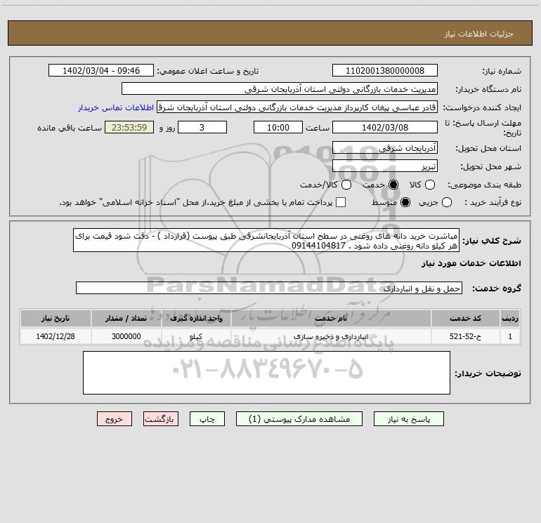 شرح کلی نیاز: مباشرت خرید دانه های روغنی در سطح استان آذربایجانشرقی طبق پیوست (قرارداد ) - دقت شود قیمت برای هر کیلو دانه روغنی داده شود . 09144104817
