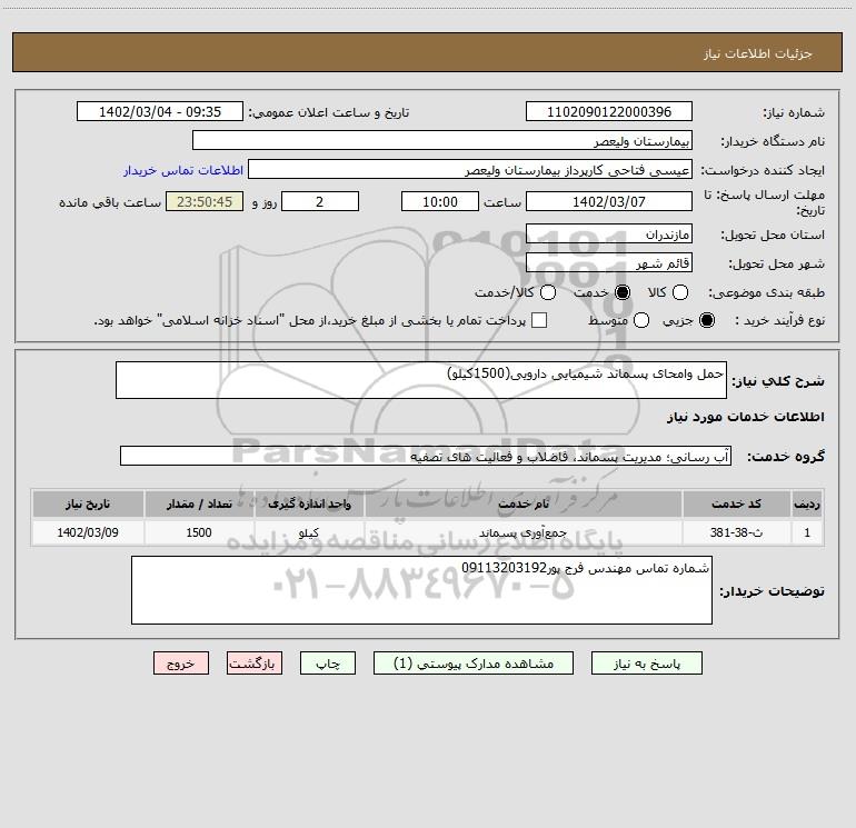 شرح کلی نیاز: حمل وامحای پسماند شیمیایی دارویی(1500کیلو)