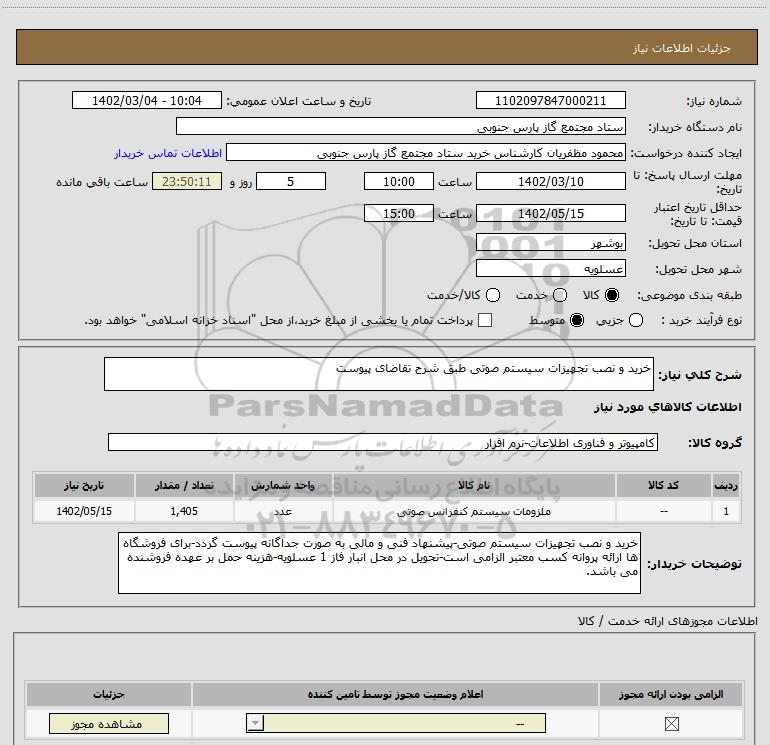 توضیحات خریدار:خرید و نصب تجهیزات سیستم صوتی-پیشنهاد فنی و مالی به صورت جداگانه پیوست گردد-برای فروشگاه ها ارائه پروانه کسب معتبر الزامی است-تحویل در محل انبار فاز 1 عسلویه-هزینه حمل بر عهده فروشنده می باشد.