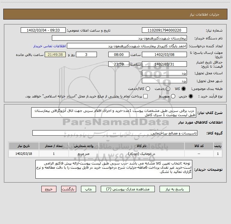 | 1 | -- | در اتوماتیک (خودکار) | متر مربع | 1 | 1402/03/18 |