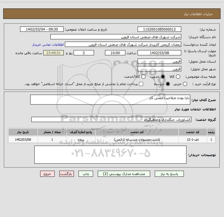 شرح کلی نیاز: دارا بودن صلاحیت ایمنی کار