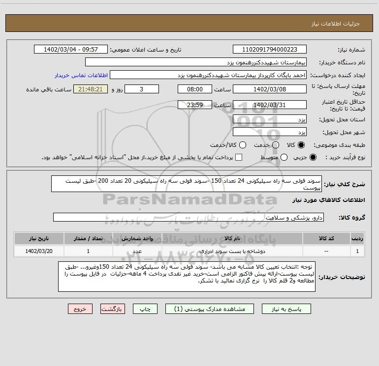 شرح کلی نیاز: سوند فولی سه راه سیلیکونی 24 تعداد 150 -سوند فولی سه راه سیلیکونی 20 تعداد 200 -طبق لیست پیوست