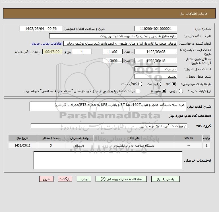 شرح کلی نیاز: خرید سه دستگاه حضور و غیابST-face160T و باطری UPS به همراه ETS(همراه با گارانتی)