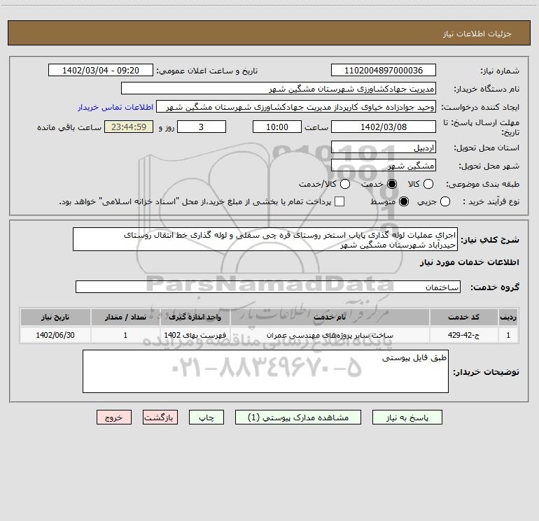 شرح کلی نیاز: اجرای عملیات لوله گذاری پایاب استخر روستای قره چی سفلی و لوله گذاری خط انتقال روستای حیدرآباد شهرستان مشگین شهر