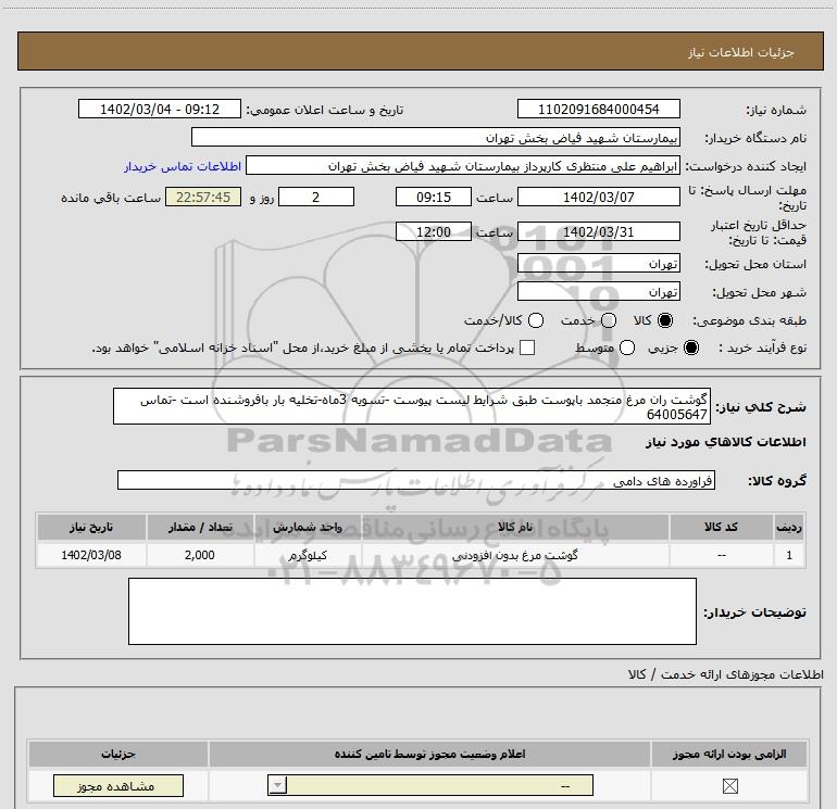 | 1 | -- | گوشت مرغ بدون افزودنی | کیلوگرم | 2,000 | 1402/03/08 |