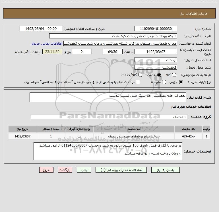 شرح کلی نیاز: تعمیرات خانه بهداشت چم سنگر طبق لیست پیوست