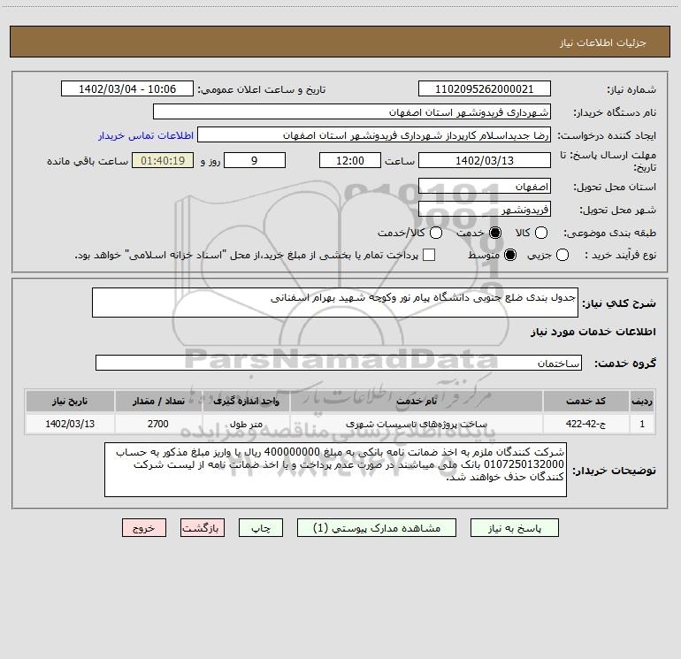 شرح کلی نیاز: جدول بندی ضلع جنوبی دانشگاه پیام نور وکوچه شهید بهرام اسفنانی