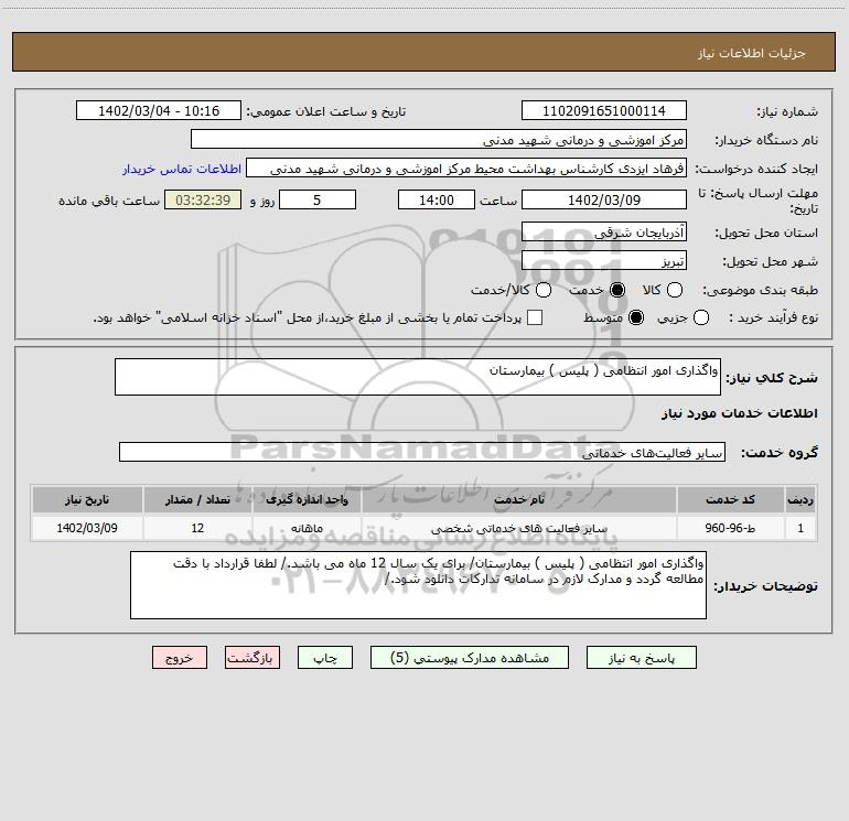 شرح کلی نیاز: واگذاری امور انتظامی ( پلیس ) بیمارستان
