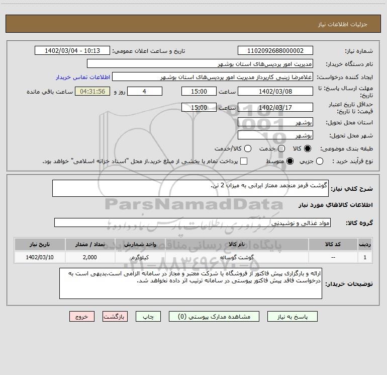 شرح کلی نیاز: گوشت قرمز منجمد ممتاز ایرانی به میزان 2 تن.