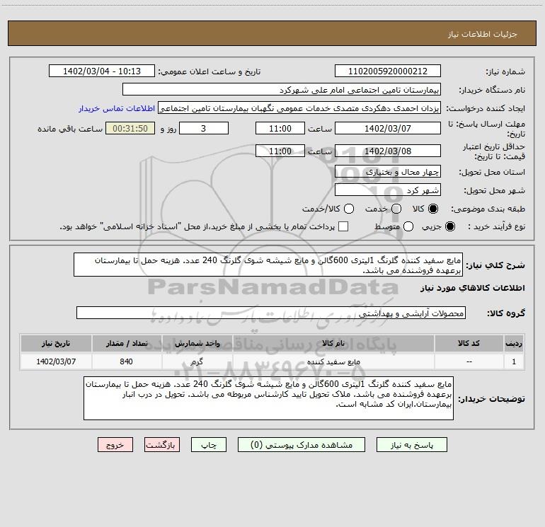 توضیحات خریدار:مایع سفید کننده گلرنگ 1لیتری 600گالن و مایع شیشه شوی گلرنگ 240 عدد. هزینه حمل تا بیمارستان برعهده فروشنده می باشد. ملاک تحویل تایید کارشناس مربوطه می باشد. تحویل در درب انبار بیمارستان.ایران کد مشابه است.